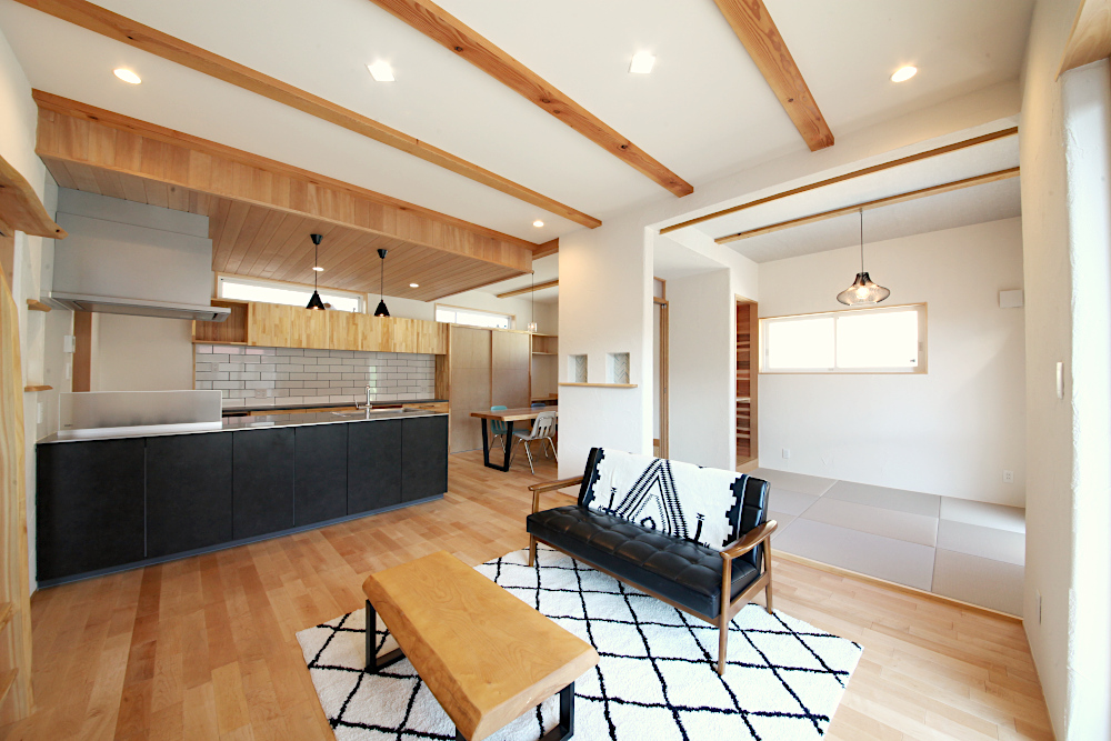 家族が集まるLDKの一角にある「土間」が特徴! 全室天然素材にこだわり、壁は全て漆喰仕上げ。機能性はもちろん、どんな空間にも調和する美しい質感は漆喰ならでは!